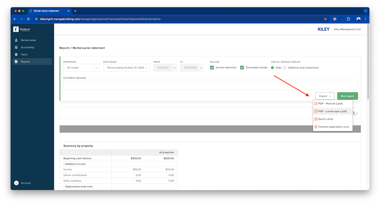 To download a PDF of the statement, select “Export” and “PDF - Landscape (.pdf)